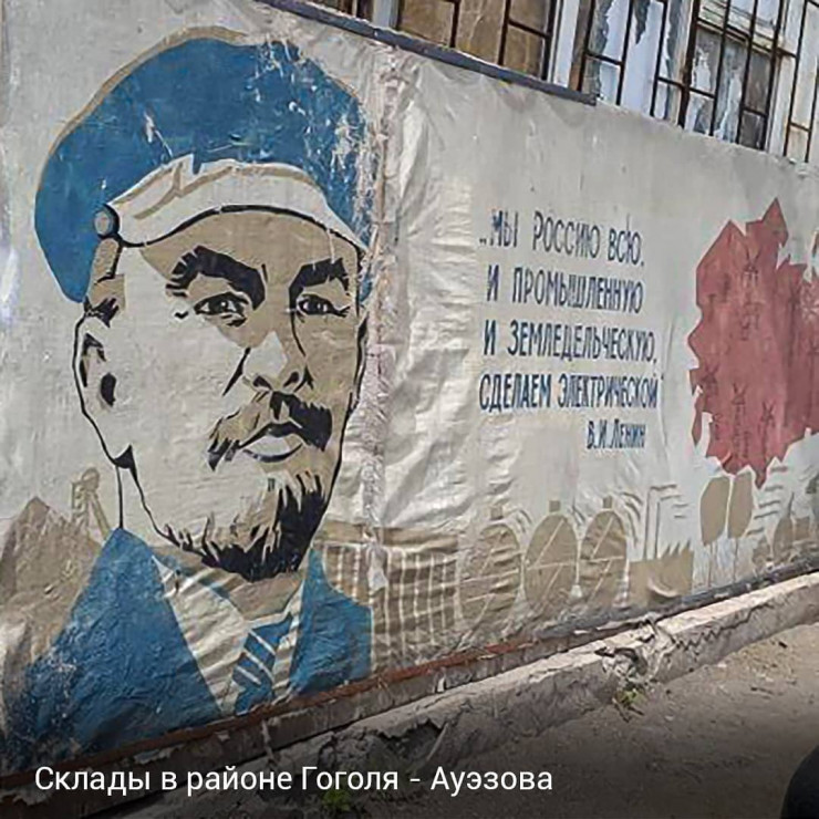 Вот такой интересный баннер с размышлениями Ленина об электрификации обнаружен на складах в районе пересечения улиц Гоголя и Ауэзова.