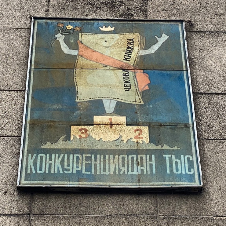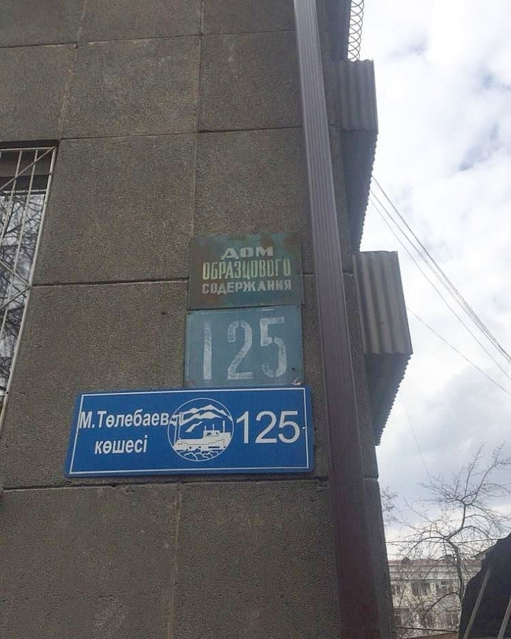 "Чековая книжка вне конкуренции" - с такой надписью на казахском языке висит табличка на доме в районе пересечения улиц Шевченко и Байтурсынова. Незадолго до распада Советского Союза с помощью таких книжек расплачивались за продукты и товары вместо наличных денег. Чековая книжка представляла собой блокнотик, на котором была написана определенная сумма. В магазине люди отрывали листочек с указанной цифрой.