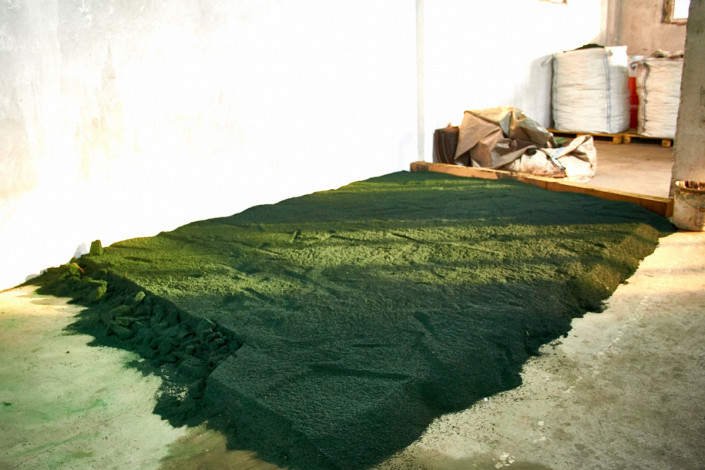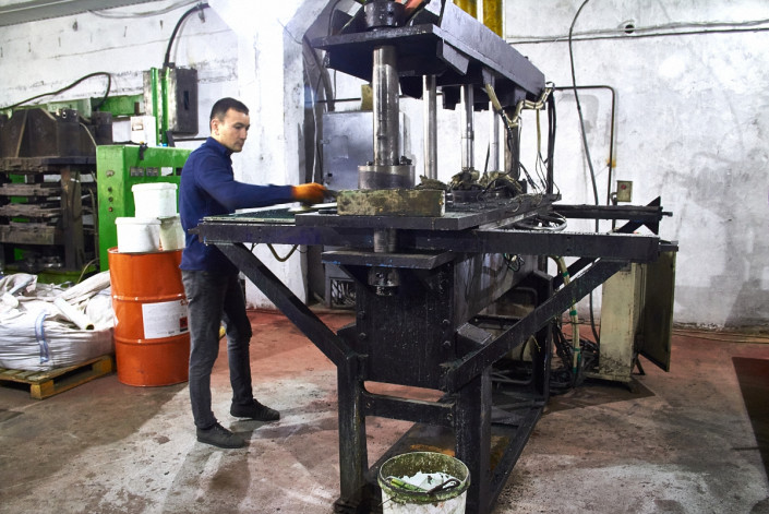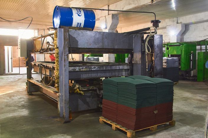 Процесс производства травмобезпасной плитки занимает 15 минут, рассказывает бизнесмен. Все ингредиенты смешиваются, заправляется оборудование и под прессом все это держится 12 минут. За это время получается 3 квадрата, и при слаженной работе за час можно успеть сделать 4 таких цикла, то есть 12 квадратов.