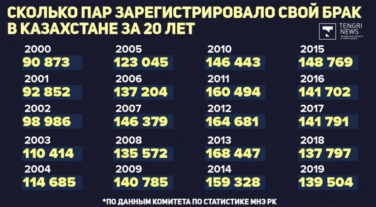 За 20 лет в Казахстане поженилась 2 699 751 пара. Пик свадеб пришелся на 2013 год, когда было зарегистрировано 168 447 браков. Но начиная с 2014 года этот показатель снижается.