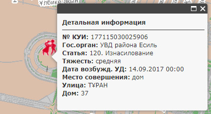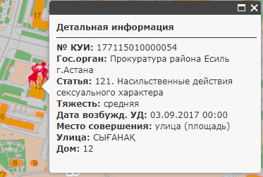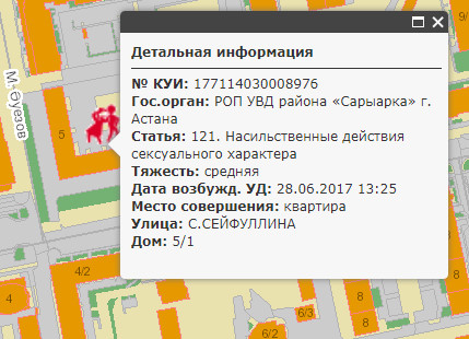 Вообще, если взглянуть на всю Карту уголовных правонарушений, то можно увидеть, что случаи сексуального насилия происходят по всей Астане, включая и пригородные поселки.