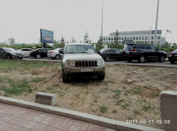 Водитель Jeep оставил свой внедорожник на газоне на углу улицы Кошкарбаева и проспекта Тауелсыздык.