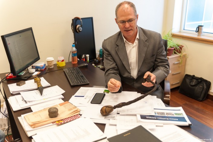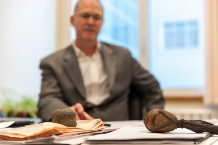- Эту вещицу я привез из Перу. Это орудие для охоты. Все эти предметы очень тяжелые, и в своем кабинете я их использую в качестве держателей, весов для многочисленных бумаг.