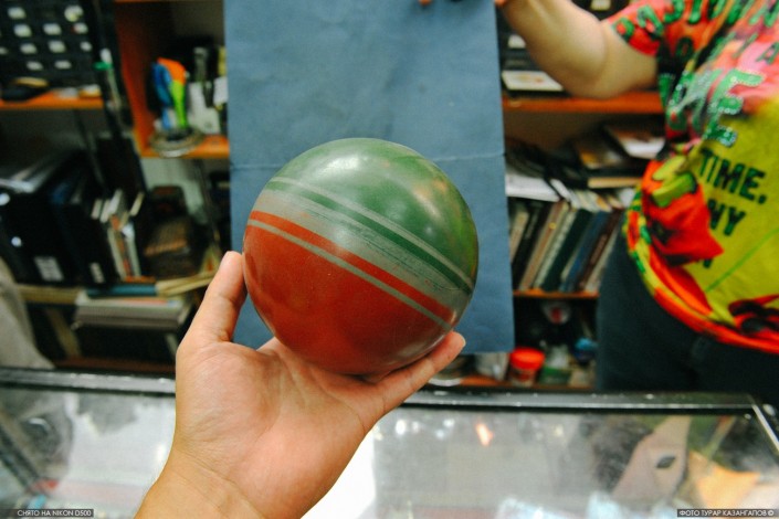 Да-да, это обычный советский мячик. Игрушка нашего детства. "Вот и вы окунулись в детство", - весело отвечает нам Семенов-старший. Тут на прилавках есть и фотоаппараты, балалайки, печатные машинки. Такой вот набор наверняка стоял у многих в сервантах.