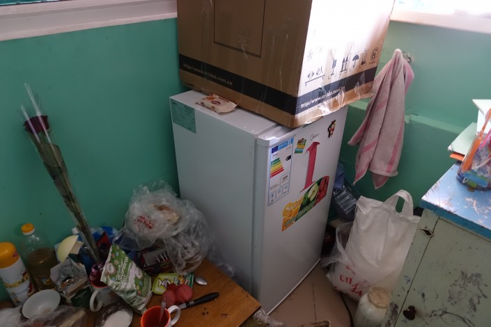В углу маленькой комнаты стоит новый холодильник, который пожертвовал кто-то из добрых людей.