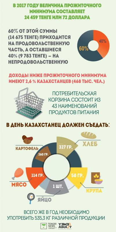 В 2017 году величина прожиточного минимума составляет 24 459 тенге, или 72 доллара, где 60 процентов от этой суммы (14 675 тенге) приходится на продовольственную часть, а оставшиеся 40 процентов (9 783 тенге) - на непродовольственную, куда входит стоимость непродовольственных товаров и услуг.
