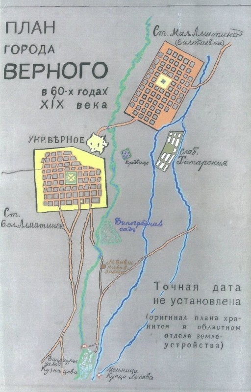 "Через некоторое время в Верном начали селиться первые купцы и прочие предприимчивые люди. В 1856 году был заложен "Казенный сад" (ныне Центральный парк культуры и отдыха), в 1857 году - построена первая водяная мельница, в 1858 году - пивоваренный завод, который положил начало местной обрабатывающей промышленности. В 1859 году геодезист Голубев отметил укрепление Верное точкой, и это место впервые появилось на картах мира", - рассказал Белоносов.