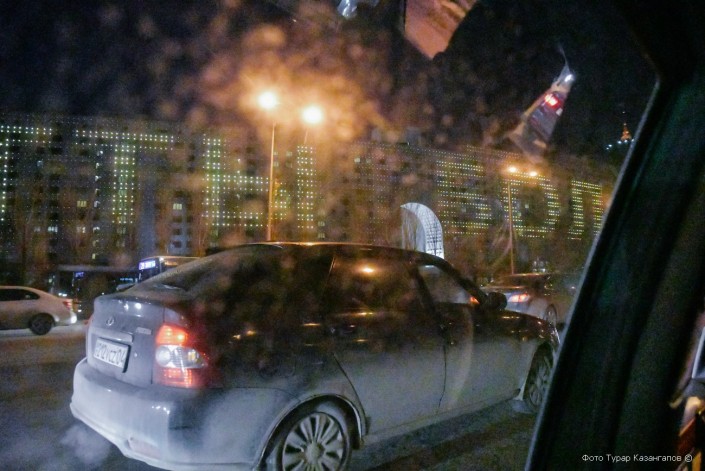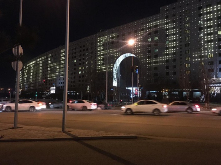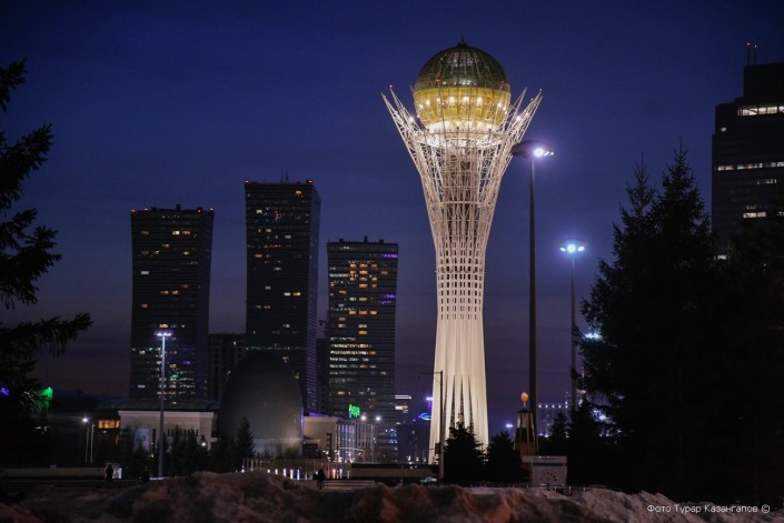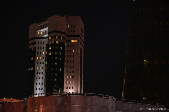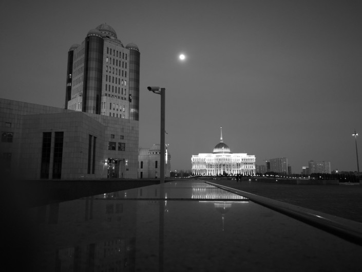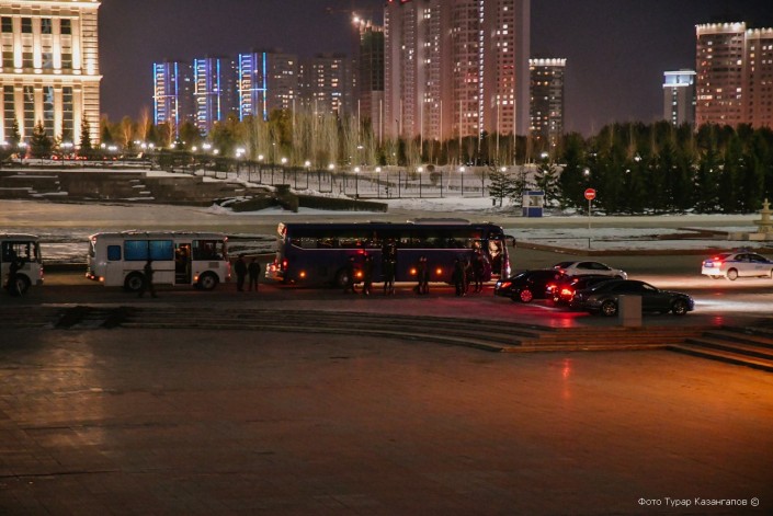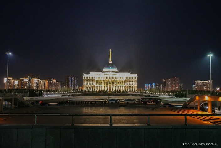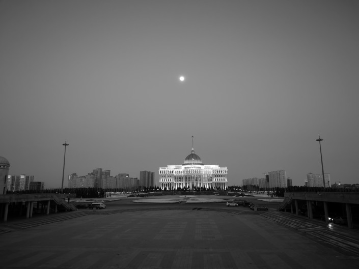 Левый берег Астаны. Административный центр. К вечеру становится морозно. Темнеет. Появляется луна. Президент только что сообщил о том, что решил сложить с себя полномочия, и сказал, что временно исполняющим обязанности Главы государства будет Касым-Жомарт Токаев.