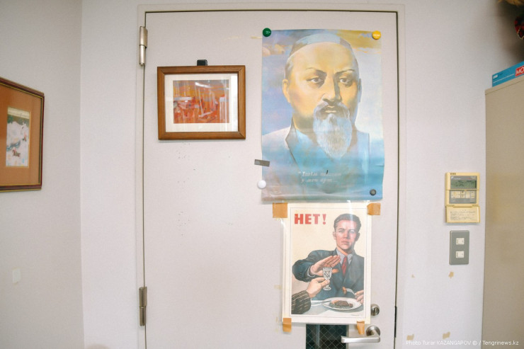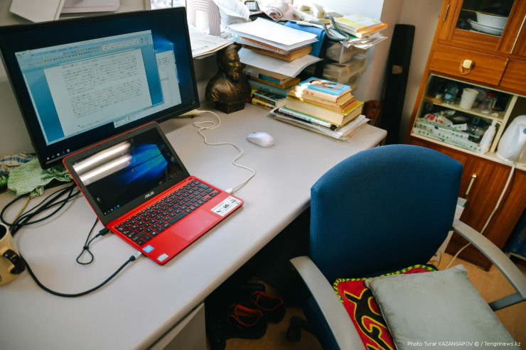 На его рабочем столе бюст Абая. Повсюду книги Абая и изображения казахского мыслителя.