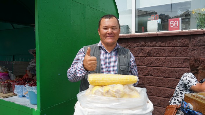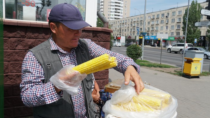 "Она у меня отличная, гарантию даю, вы прямо здесь при мне попробуйте, и если она вдруг вам не понравится, то можете не платить. Честно говорю, я за свой товар отвечаю", - говорит Болатбек. Эти слова звучат очень убедительно, люди протягивают деньги и получают золотистую кукурузу.