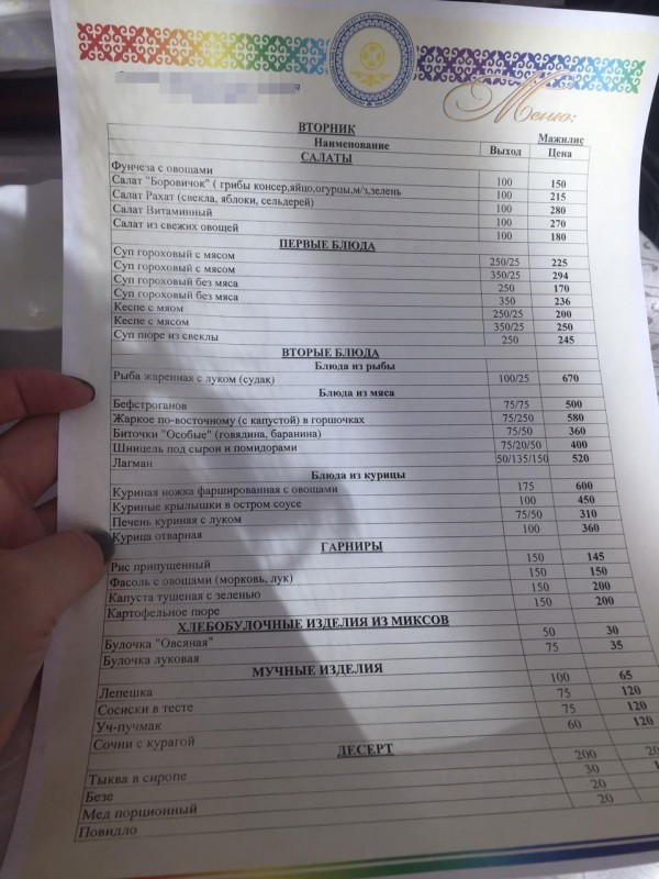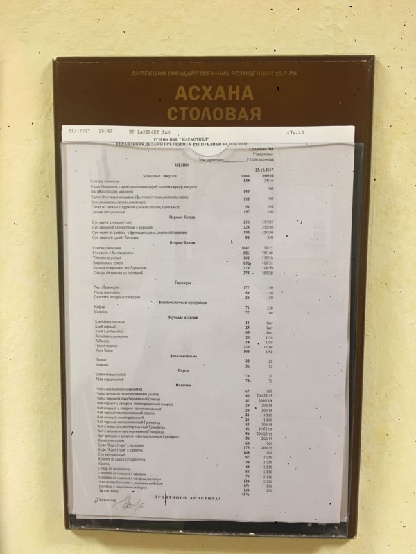 Обед в здании правительства в среднем стоит около 1000 тенге. К примеру, борщ с мясом и сметаной - 264 тенге, тушеная говядина с грибами - 649 тенге, цветной рис на гарнир - 67 тенге, компот - 38 тенге.