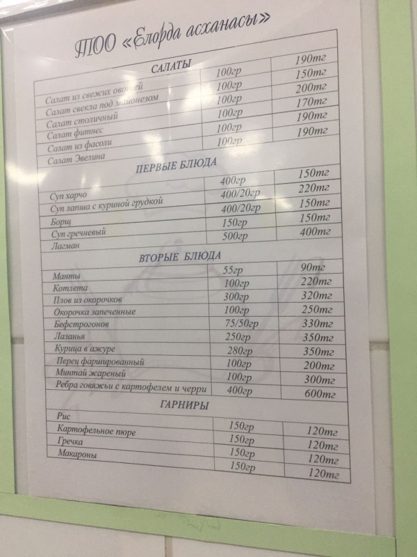 Салат из свежих овощей - 190 тенге, куриный суп - 220 тенге, плов из окорочков - 320 тенге.