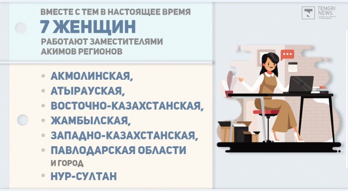 7 женщин являются заместителями акимов регионов и города республиканского значения.