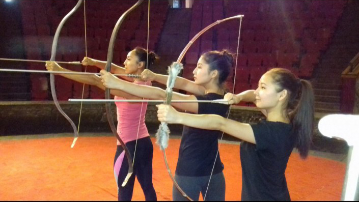 "На самом деле это очень сложно, так как нужно держать равновесие, нужно стоять на руках, держать ногами стрелу и натягивать тетиву лука. Те девочки, которые стреляют из лука ногами, пришли к нам с юного возраста, с 7-8 лет. На протяжении всего этого времени они у нас тренировались, получали физическую подготовку. Сначала выпускались номера, не связанные именно с ножной стрельбой из лука. У каждой из них есть свой оригинальный жанр и номера. В этом году на Игры кочевников мы решили сделать групповой номер по ножной стрельбе из лука, так как на прошлых Играх кочевников именно эта стрельба из лука привлекла большое внимание", - также отметила Аида.