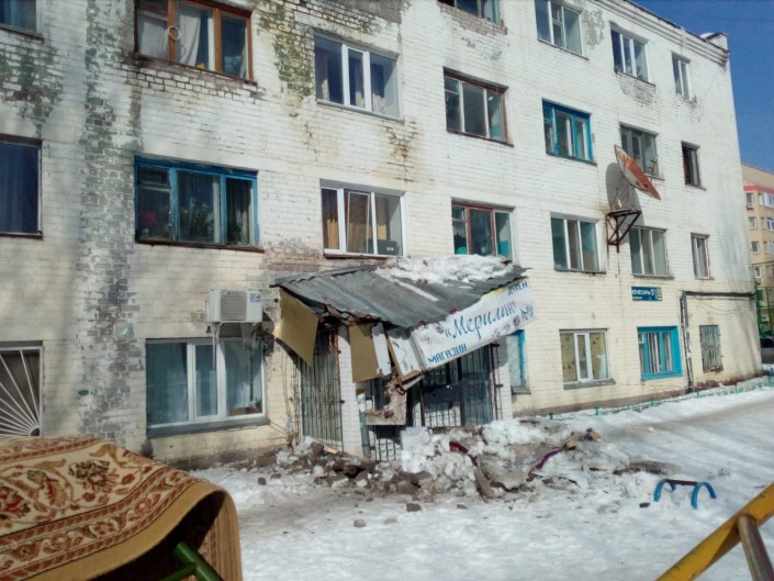 Кирпичи со стены упали на козырек временно не работающего магазина.