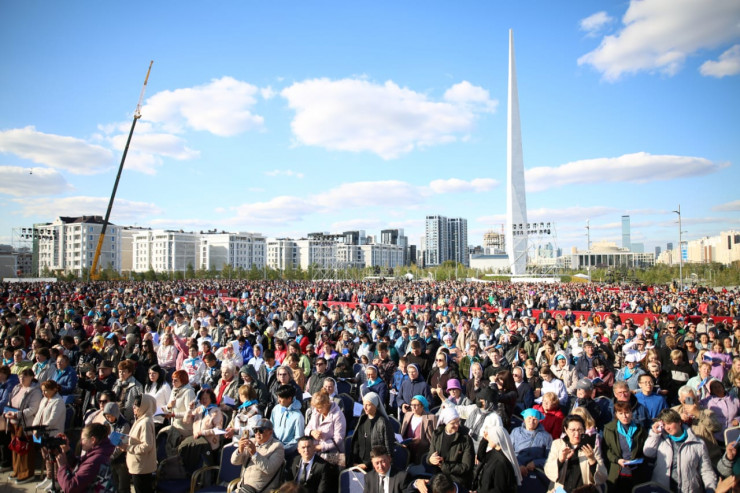 Тысячи казахстанцев собрались на территории международного выставочного центра EXPO, чтобы послушать святую мессу с участием Папы Римского Франциска, передает корреспондент Tengrinews.kz.