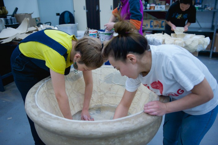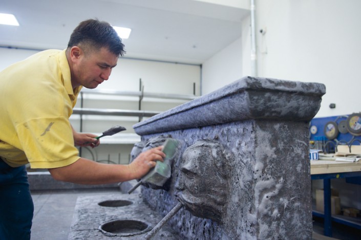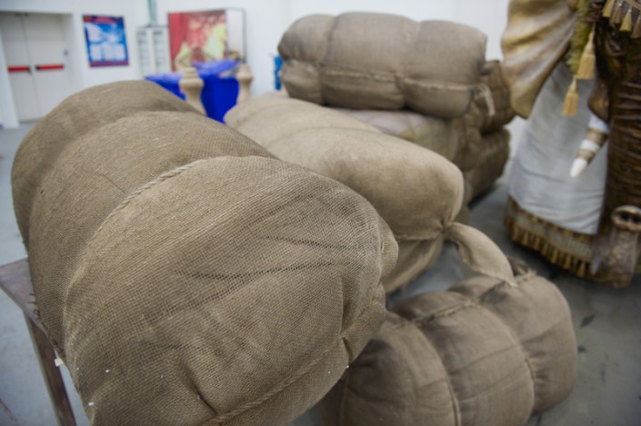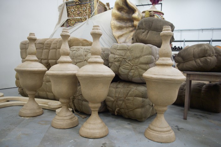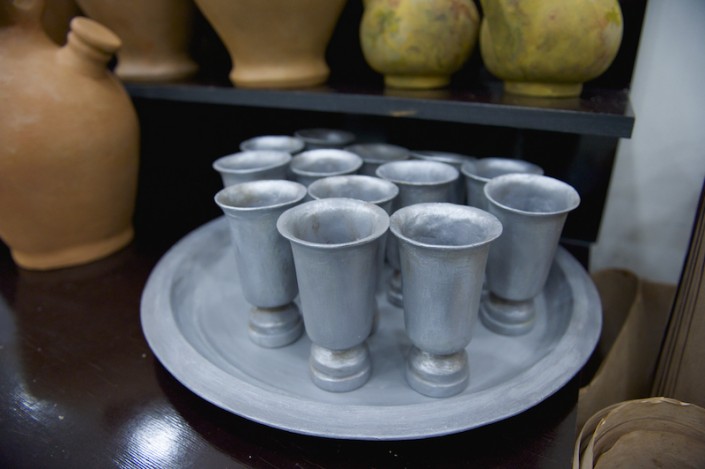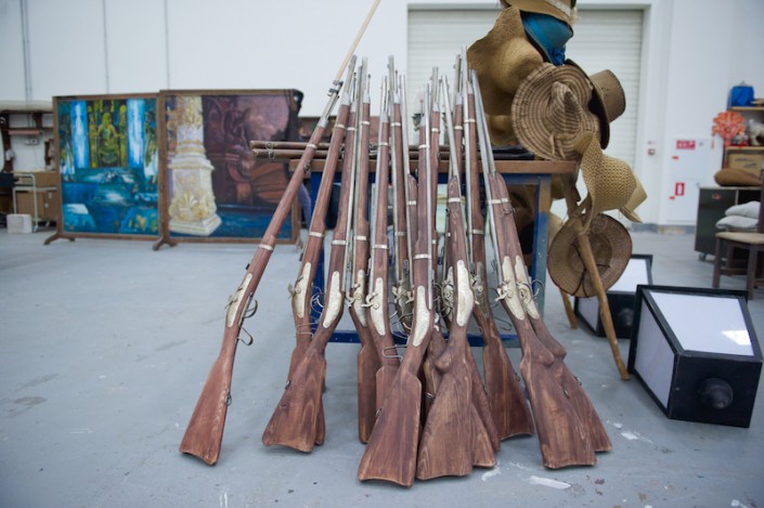 "Необычной формы посуда, кувшины, вазы удивили нас сразу, как только мы увидели эскизы. Изготовлялись они по технологии папье-маше, но вначале отливались формы, вытягивались глиной, затем  заливались гипсом, а уже потом лепилось папье-маше, - рассказывает художник-бутафор, скульптор Даурен Омаров. - Бутафорские ружья по технологии изготовления идентичны настоящим: дерево, металл и чеканка, а если добавить специальный механизм, то они смогут даже стрелять. Светильники выполнены из дерева, но так задекорированы, что выглядят, как будто сделаны из старой латуни, с проступившей на железных вставках ржавчиной".
