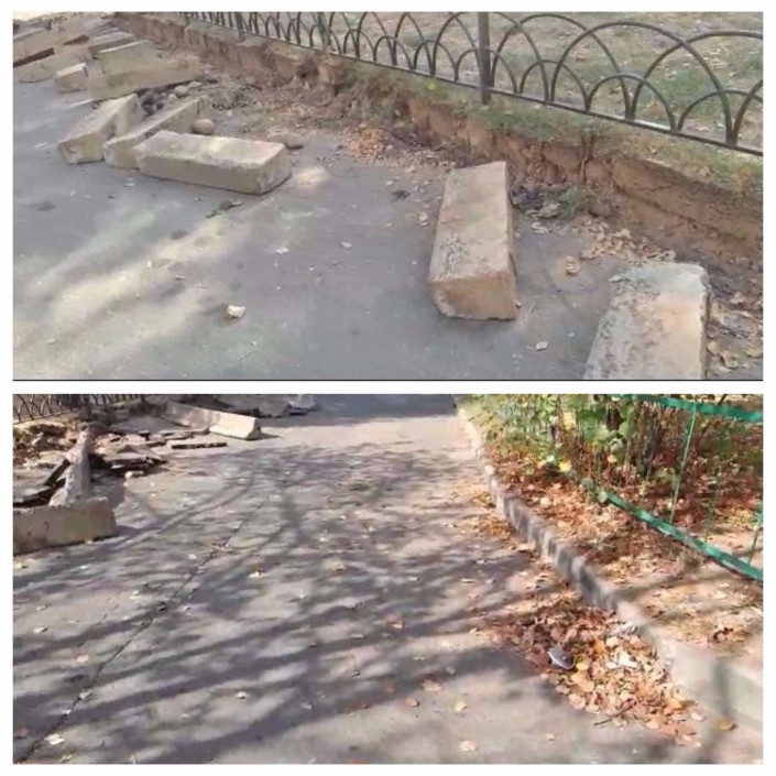 Еще одно сообщение из Алматы. "Хотел "похвалить" городской акимат и акимат Ауэзовского района за такую заботу о наших бордюрах. Меняют их во дворе каждые два года, "молодцы", что сказать. Хотя, например, могли бы сливную и арычную системы восстановить, чтобы вода во время дождя бежала по арыку, а не по асфальту (...)", - пишет возмущенный алматинец.