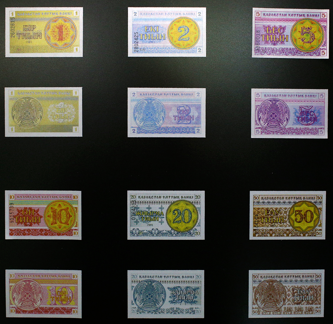 Монеты национальной валюты были выпущены позже. На момент создания банкнот выпуск монет запаздывал и было принято решение пустить в обращение бумажные тиыны. "Наладить производство монет оказалось не так быстро. Пришлось делать бумажные тиыны. Тенге без тиынов в обращение пустить нельзя было. В течение двух недель мы выдавали в день по одному тиыну", - рассказал дизайнер тенге Мендыбай Алин.