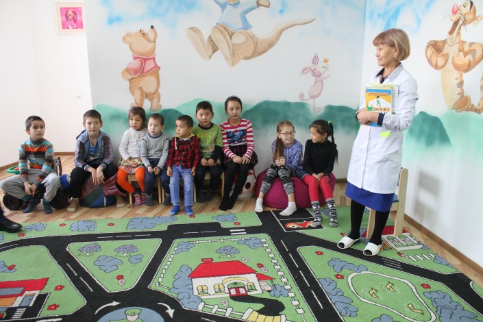 Делегация во главе с Еленой Тарасенко входит в яркую комнату, похожую на ту, которые бывают в детсадах. Там много детишек. Они здесь, пока родители на работе.