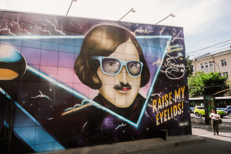 "Гоголь". Автор — стрит-артист Andrew из мастерской Repas. При создании работы был смиксован классический портрет писателя с тематикой "ретровейв" (стилистику 80-х отличают неоновые краски). Цитата "Поднимите мои веки" взята из мистического произведения "Вий".