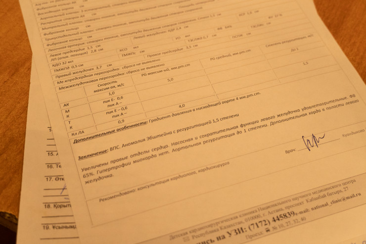 "Вот представьте сердце, по бокам у него два клапана работают. Это если в норме. А у Тамирис один клапан расположен не сбоку, а внизу. В результате это дает сбой, что-то у нее там сжимается, перекрывает, может, воздуха не хватает, появляется одышка, она начинает синеть, идет паническая атака. Операция заключается в том, чтобы клапан  переместить из нижней части на бок, тогда будет норма", - говорит Тогжан.
