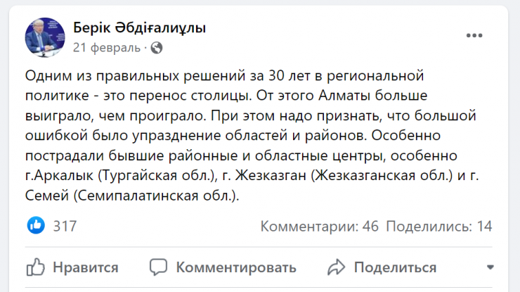 - После январских событий я написал пост в Facebook, что одно из несправедливых решений, которые остались, упразднение этих областей. Надо исправить эту ситуацию. Когда я был депутатом, я приехал сюда. Народ тут собирал подписи Президенту с просьбой восстановить Жезказганскую область. Но Президент опередил. Он, видимо, об этом давно знал, думал. (...) Сейчас осталась нерешенной область Торгайская. Думаю, это дело будущего. Необходимо развивать Аркалык.