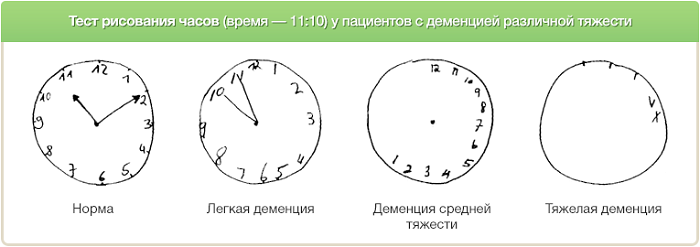 - Есть простейший тест "Рисование часов": необходимо нарисовать циферблат, расставить цифры и указать на них заданное врачом время. Этот скрининг вы можете провести дома самостоятельно буквально за несколько минут. Он позволяет сказать, есть ли отклонения у человека. Если цифры или стрелки убегают из поля, есть неточности в расположении цифр или стрелки показывают неправильное время, то следует обратиться к врачу.