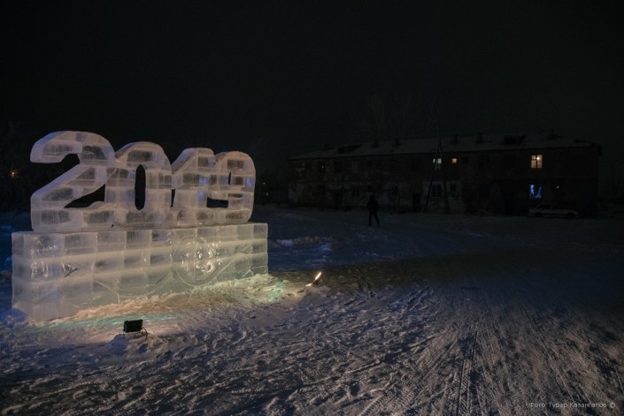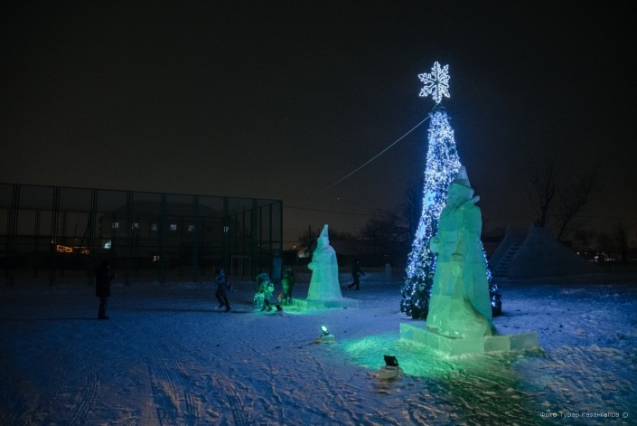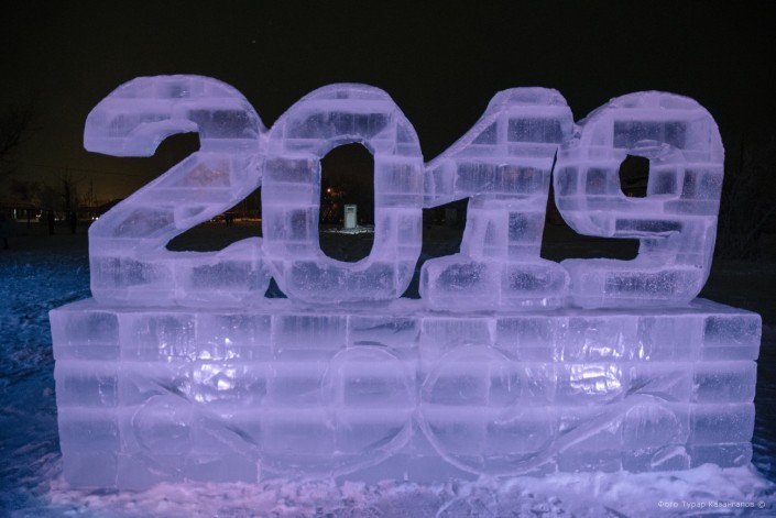 В столице Казахстана за центральным рынком построили ледовый городок. Рядом с нарядной елкой - большая ледяная цифра 2019.