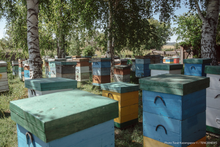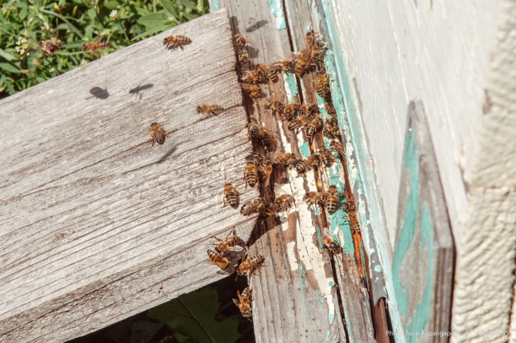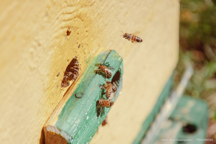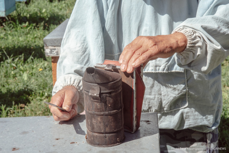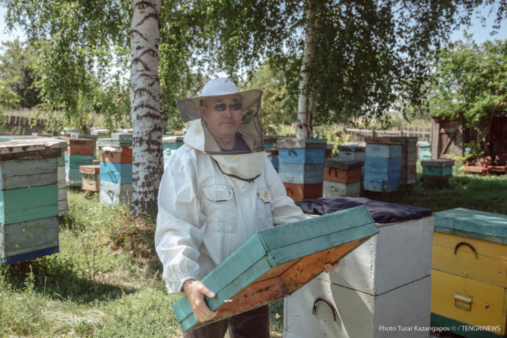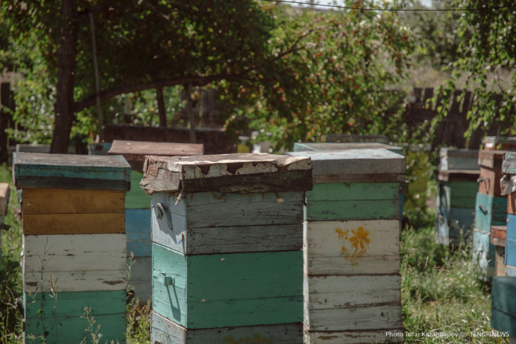 Отметим, что условия съемки близки к экстремальным. В то время как Мубарак Рахимбаевич в защитном костюме, наш фотограф ходит между ульями в штанах и футболке.