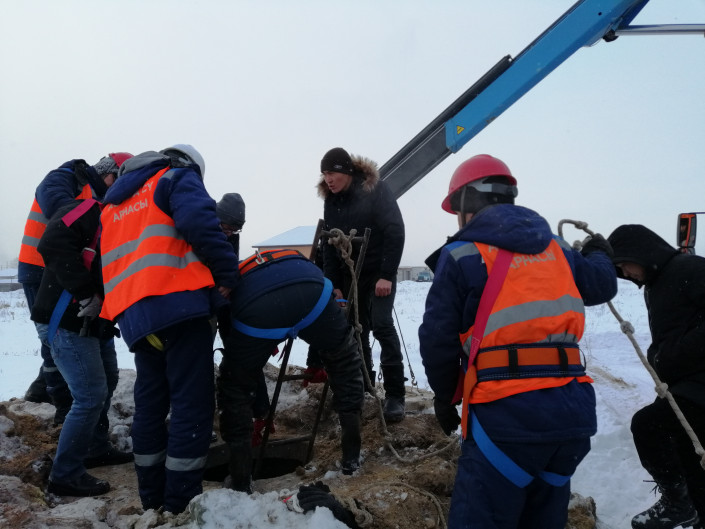 После того как рабочие определили, нет ли в колодце опасных паров, внутрь спускается Бақытбек Бидахметов. Он волонтер. Участвовал в поисках Бакдаулета в феврале этого года. Мужчина был в составе той группы, которая и нашла тело ребенка на дне этого колодца.