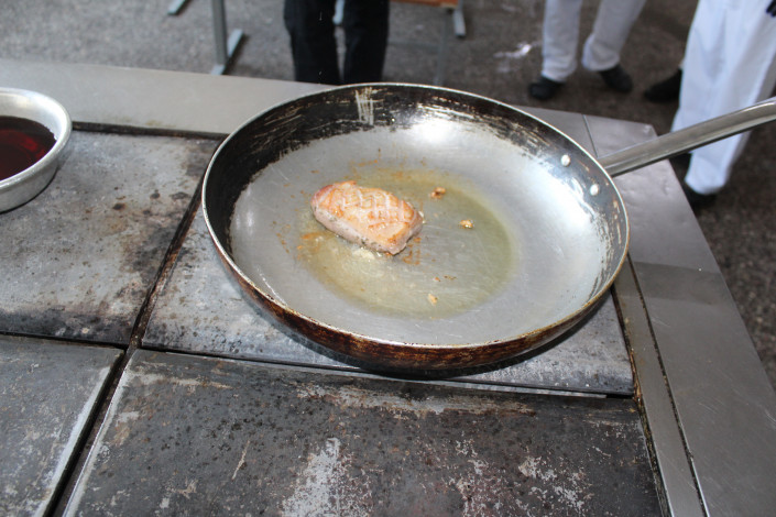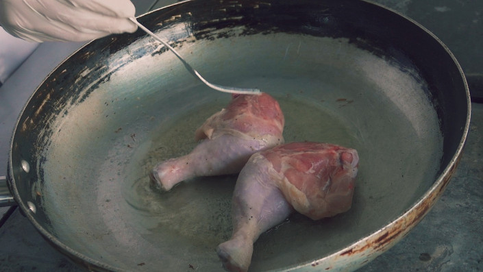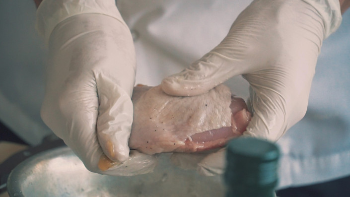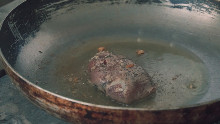 Шеф-повар Рустем обжаривает утиное и куриное филе.