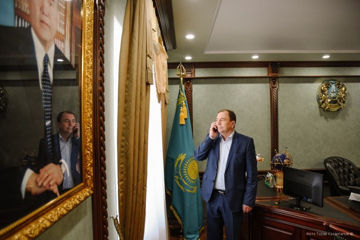 Кстати, вот так выглядит офис Сауэра. Возле двери у входа в его кабинет висит табличка, где, помимо должности, указано, что он обладатель высокой награды - Қазақстанның Еңбек Ері, то есть Герой труда.