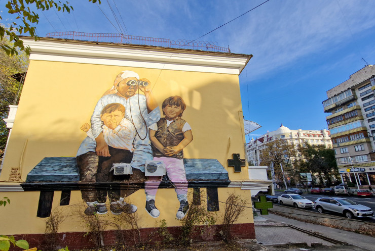 Большинство муралов в Алматы были созданы в рамках международного фестиваля Mural Fest, инициированного общественным фондом "Дети рисуют мир". Мурал с апашкой ("Ожидание", авторы Сауле Сулейменова и Куаныш Базаргалиев) как раз был нарисован в рамках этого фестиваля.