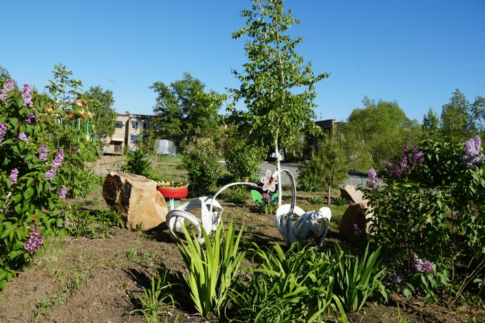 А тем временем во дворе Ольга Георгиевна Коняхина заботливо поливает свой оазис.