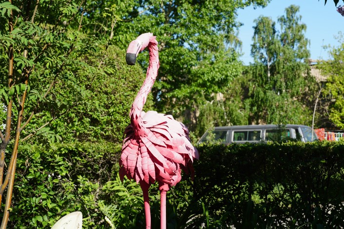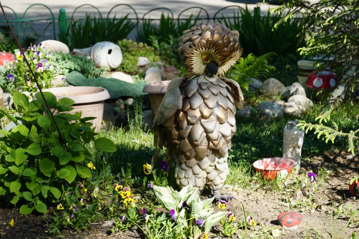 Гордость этого двора - фигуры животных посреди цветущих клумб.