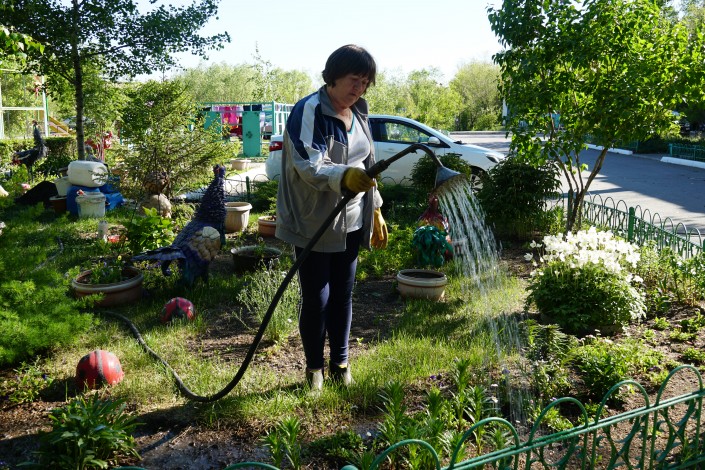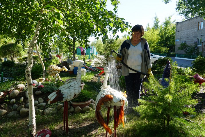 "Елку из Екатеринбурга привезли, осину с березами - с каньона, из Новоуральска - лилию, оттуда же, из леса, папоротник. Гортензию из Киргизии в чемодане привезла. Вот теперь все это растет, и за всем ухаживать надо", - отмечает женщина, поливая сад.
