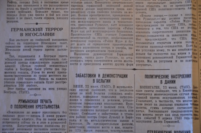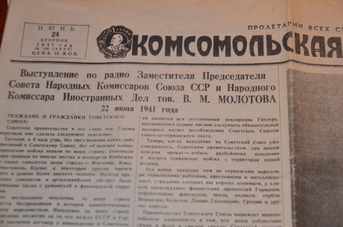 На главной  странице, прямо рядом с портретом лидера, описано выступление по радио заместителя Председателя Совета Народных Комиссаров Союза ССР и Народного Комиссара Иностранных Дел тов. В. М. МОЛОТОВА 22 июня 1941 года.
