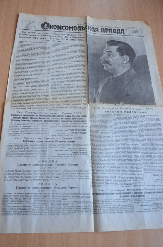 Памятное воскресенье 22 июня 1941 года пришлось на празднование святой Троицы. А уже спустя два дня на свет появился первый военный выпуск "Комсомольской правды", на главной странице которого портрет Иосифа Сталина.