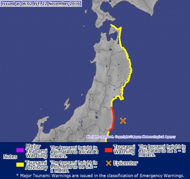 В целом ряде прибрежных населенных пунктов была объявлена угроза цунами, населению предписано эвакуироваться на места, расположенные на возвышенности. Как ожидалось, высота волн могла достичь трех метров. Однако спустя несколько часов после подземного толчка, в некоторых районах наблюдались волны высотой до 1,4 метра, а в районе атомной станции в Фукусиме - до одного метра.