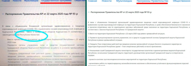 Вывод. Фотография распоряжения правительства № 93-p от 22 марта, содержащая слова "Республика Казахстан", является скриншотом страницы сайта с ошибочным переводом Google translate с кыргызского языка", - подтвердили в издании factcheck.kg.
