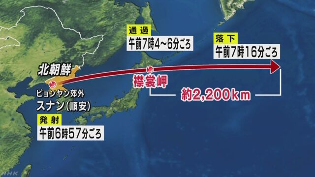Утром в пятницу, 15 сентября, японский телеканал NHK сообщил о пуске Северной Кореей баллистической ракеты, которая пролетела над территорией Японии и упала в Тихий океан в двух тысячах километрах от мыса Эримо на острове Хоккайдо.