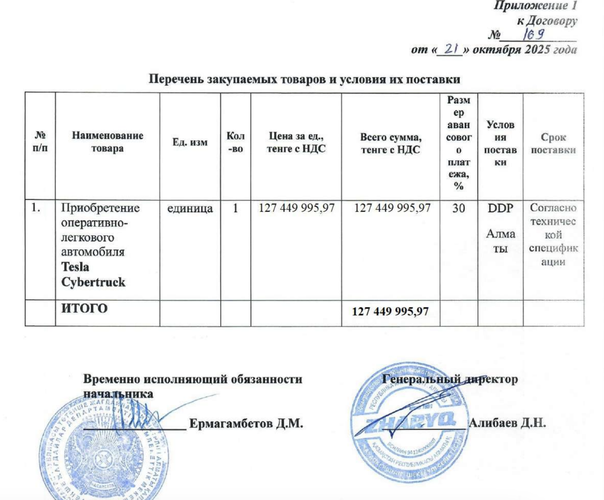 На портале госзакупок размещён договор, по которому департамент по ЧС Алматы заказал у ТОО Zharyq "оперативно-служебный автомобиль" Tesla Cybertruck.