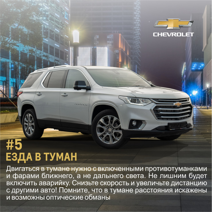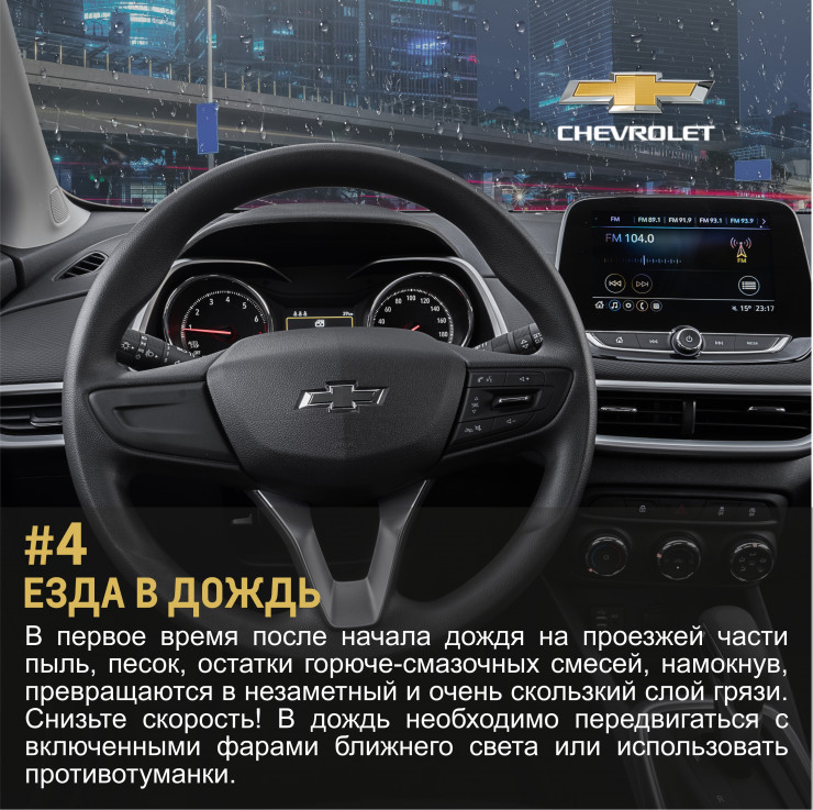 В ненастную погоду на помощь водителю могут прийти новые технологии, такие как зонированный климат-контроль, светочувствительные наружные зеркала, а также функция контроля боковых слепых зон вместе с системой оповещения об опасности при смене полосы. Данные функции доступны на автомобилях Chevrolet Equinox, Chevrolet Traverse и Chevrolet Tahoe.