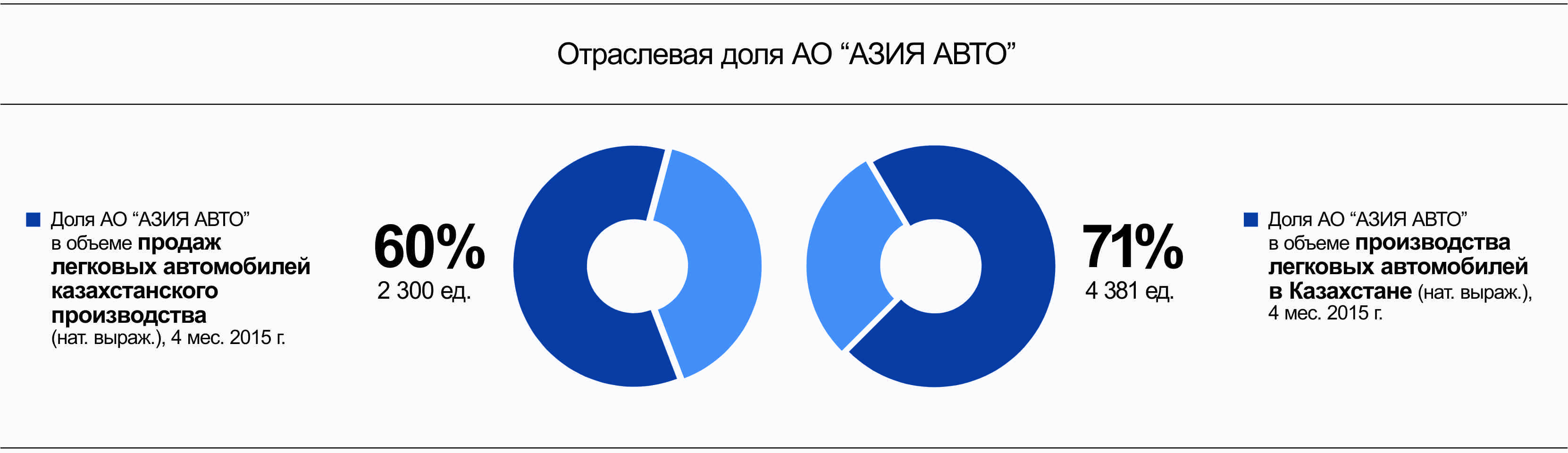 Тем не менее усть-каменогорский завод "АЗИЯ АВТО" сохраняет за собой позиции отраслеобразующего предприятия, на долю которого в январе-апреле 2015 года пришелся 71 процент всех выпущенных на территории Казахстана легковых и легких коммерческих авто. Работа завода обеспечила 11 процентов выпуска продукции всех машиностроительных предприятий страны.