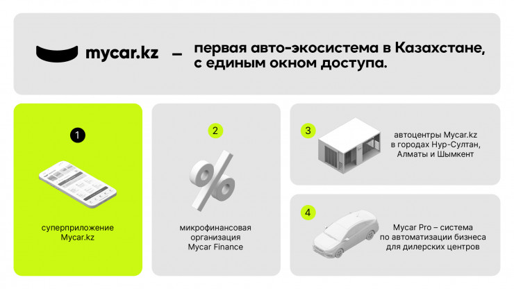 Экосистема Mycar.kz состоит из приложения, автоцентров, микрофинансовой организации и системы по автоматизации бизнеса. Все продукты бренда доступны через приложение, где можно выбрать автомобиль, получить предварительное одобрение на автокредитование, записаться на сервис или технический осмотр, продать автомобиль через классифайд (онлайн-витрина объявлений).