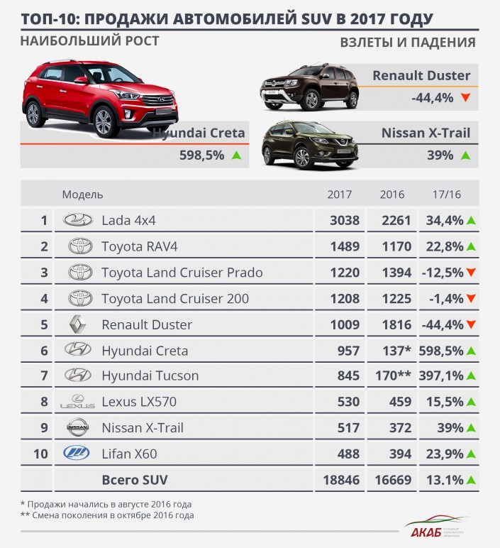 Аналитики АКАБ отметили, что по итогам года темпы прироста более чем в два раза превышают динамику рынка, а доля кроссоверов и внедорожников в общем объеме продаж приближается к 40 процентам.