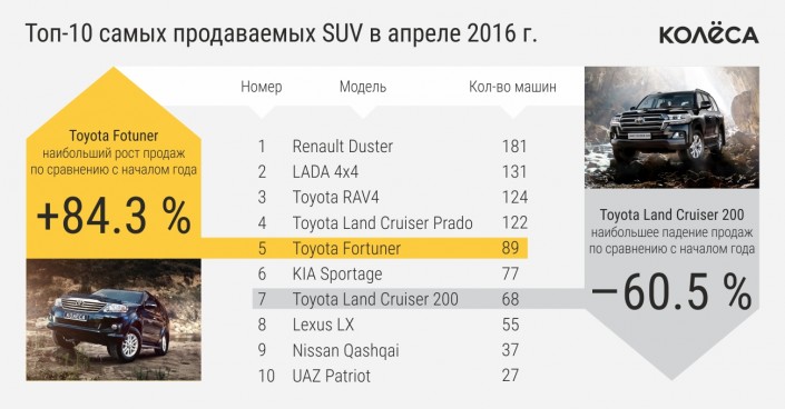 В ТОП-25 наиболее продаваемых автомобилей в Казахстане в апреле вошли 10 представителей класса SUV. Лидером с результатом в 181 авто стал бюджетный Renault Duster, вторую строчку взяла LADA 4×4 (131 единица), а замкнул тройку лидеров RAV4 (124 единицы). Отдельно стоит отметить и собираемый в Казахстане Fortuner (89 единиц). За апрель локальные дилеры марки сумели реализовать больше машин, чем за весь первый квартал.