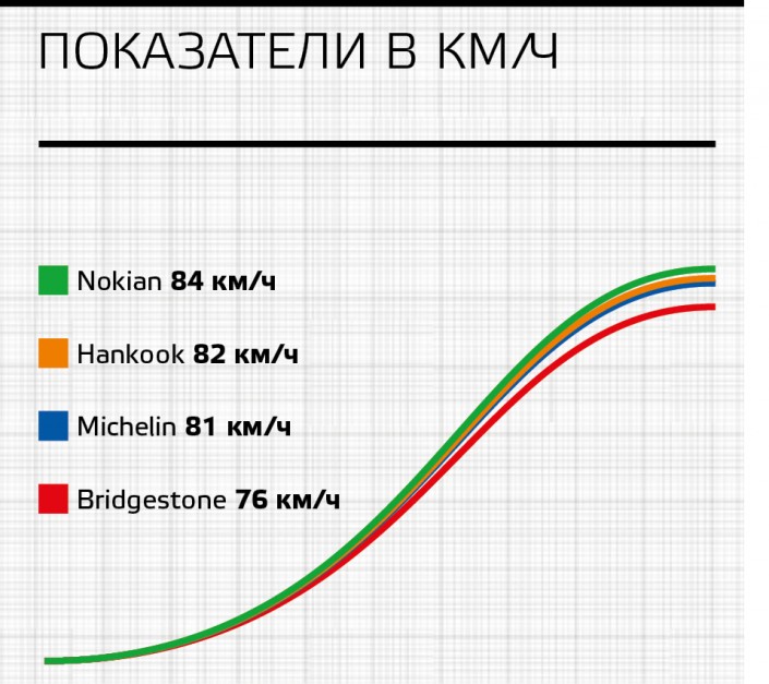 "До какой скорости шины сопротивляются этому эффекту, мы выясняли на треке, залитом семимиллиметровым слоем воды. Тут как раз начинают работать технологии: высота, компаунд, рисунок и архитектура протектора. Лучшим результатом является максимальная скорость, при которой передние колеса начинают всплывать над поверхностью дорожного полотна. Быстрее всех в данной дисциплине "всплывает" комплект Bridgestone, не дожидаясь отметки в 80 километров в час", - рассказал о результатах исследования Роман Масленников.