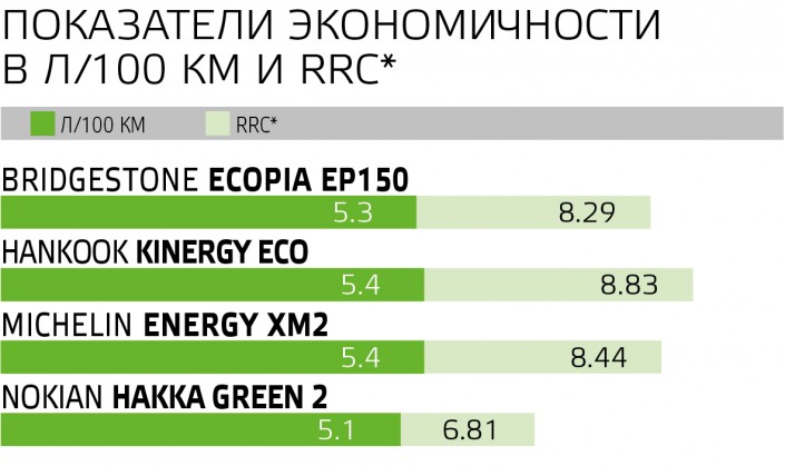 Методика измерений расхода топлива - прохождение дистанции 10 километров с постоянной скоростью 80 километров в час с активированным круиз-контролем. Коэффициент сопротивления качению демонстрирует потребление энергии во время деформации покрышки, которая возникает во время сцепления шины с дорогой. Чем ниже показатель, тем экономичнее покрышка. Разница между крайними результатами составляет 300 граммов бензина на каждую сотню. За 50 тысяч километров водитель может сэкономить 150 литров топлива.